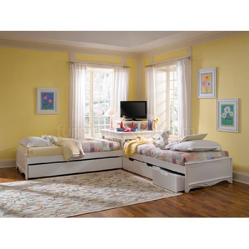 Lea Haley Bedroom Set w/ 2- Bed Corner Unit 012-2BED-BR-SET. The Haley Bedroom Set w/ 2- Bed Corner Unit by Lea Industries is constructed using select hardwood solids with a white painted color finish. The hardware is a wood knob with a brushed pewter color insert, adding to the overall casual appeal of the collection. This furniture set features thick drawer fronts and heavy top panels that add a sturdy quality to each furniture piece. Design elements such as, soft, curved shapes and a floral hand carved motif give Haley a lasting appeal for all young ladies.The Haley Bedroom Collection is a feminine, casual lifestyle girl's group created to offer you a furniture collection with lots of options and unique storage bed configurations. Please Note: Underbed Storages are optional. Features: Durable construction. Stylish and practical furniture design. White Painted Color Finish Select Hardwood Solids and Select Wood Products. White Painted Color Knob Hardware with Brushed Pewter Color Inserts Center Mount Drawer Guides with Built-In Drawer Stops Thick Drawer Fronts and Curved Pilasters Dimensions: 012-923 (2) Platform Bed Ends 3/3 - Twin W42 D2 H18 012-023(2) WOOD RAILS w/SLAT PACK 3/3 - TWIN W76 D2 H5 012-301 CORNER UNIT W42 D42 H30 012-411 NIGHTSTAND W22 D17 H27 012-030 VERTICAL MIRROR W35 D2 H43 012-261 DRAWER DOUBLE DRESSER W54 D18 H34 012-151 DRAWER CHEST W36 D18 H50 012-221 FOOTBOARD DRESSER 3/3 TWIN W44 D18 H23 012-345 DRAWER DESK W42 D18 H30 012-774 CHAIR W18 D22 H39 012-909 DUAL FUNCTION UNDERBED STORAGE UNIT W75 D40 H10 012-913 3 DRAWER UNDERBED STORAGE BOXES Each box: W25 D25 H10 Some assembly may be required. Set Includes: 1 Haley Two Platform Beds w/ Corner Unit